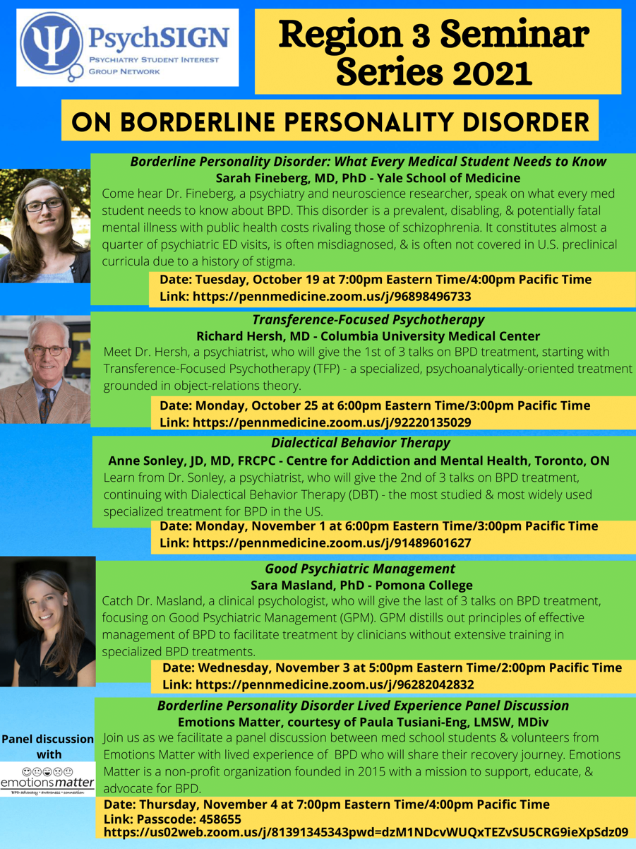 To address the stigmatization of borderline personality disorder (BPD) in medicine, I hosted a seminar series on borderline personality disorder in 2021 in my capacity as Region 3 chair of the Psychiatry Student Interest Group Network (PsychSIGN). This included a collaboration with the non-profit organization Emotions Matter to hold a panel discussion of medical students with people with lived experience of BPD.